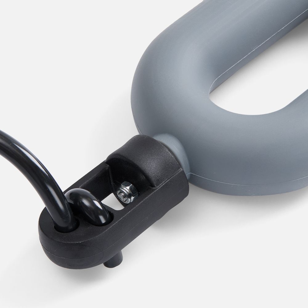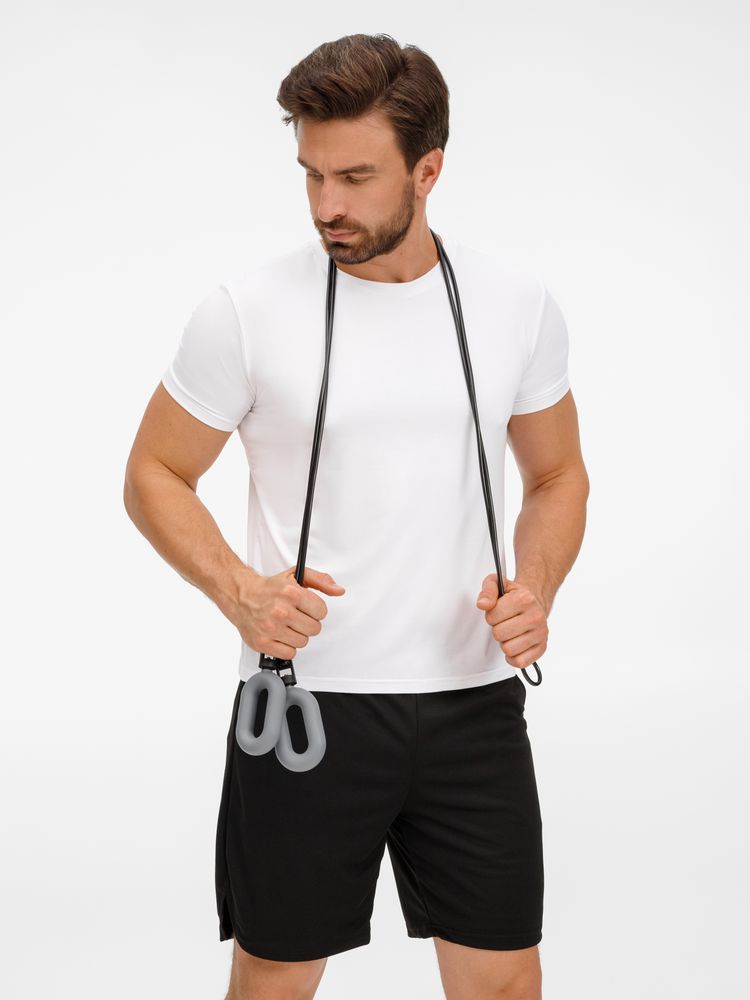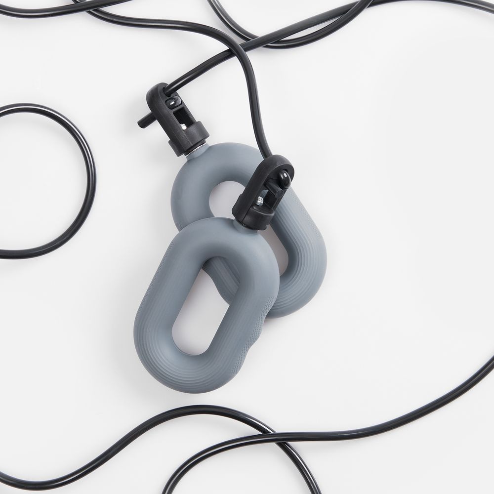 Шнур к ручкам-эспандерам крепится через пластиковый переходник с отверстиями для продевания шнура. Эспандеры выполнены из тактильно приятного силикона, обладающего высокой степенью эластичности и прочности, а широкий шнур (5 мм) — из плотного ПВХ.