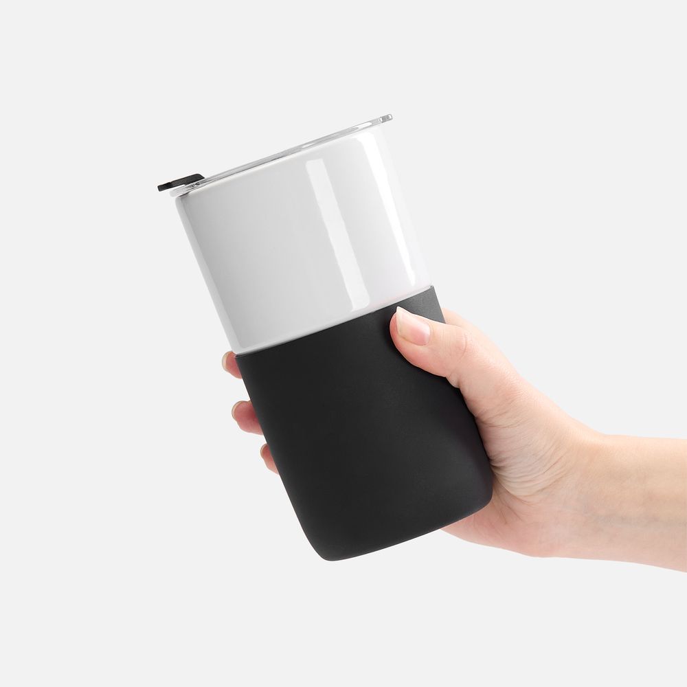 Прочная керамика — и напиток не впитает посторонних запахов и вкусов, силиконовый рукав — и стакан не обожжет руки, плотная крышка — и содержимое не прольется и не остынет слишком быстро.