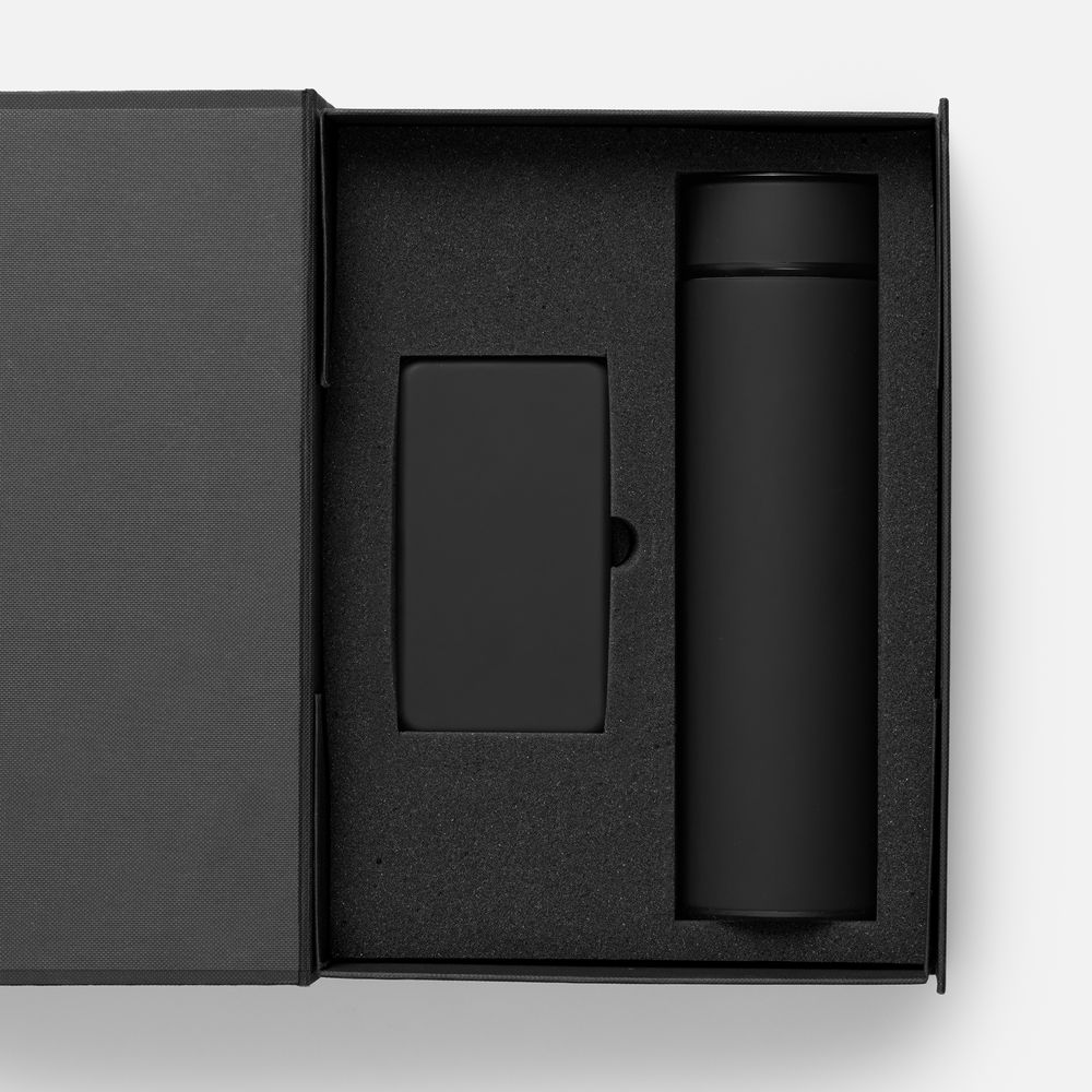 Материал: аккумулятор - пластик; покрытие софт-тач; термос - нержавеющая сталь, 304; покрытие софт-тач; коробка - переплетный картон