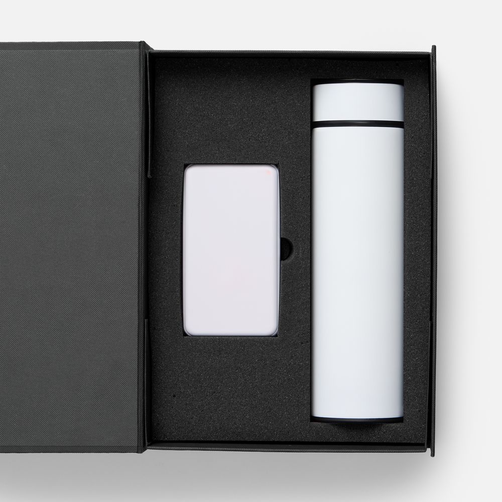 Материал: аккумулятор - пластик; покрытие софт-тач; термос - нержавеющая сталь, 304; покрытие софт-тач; коробка - переплетный картон