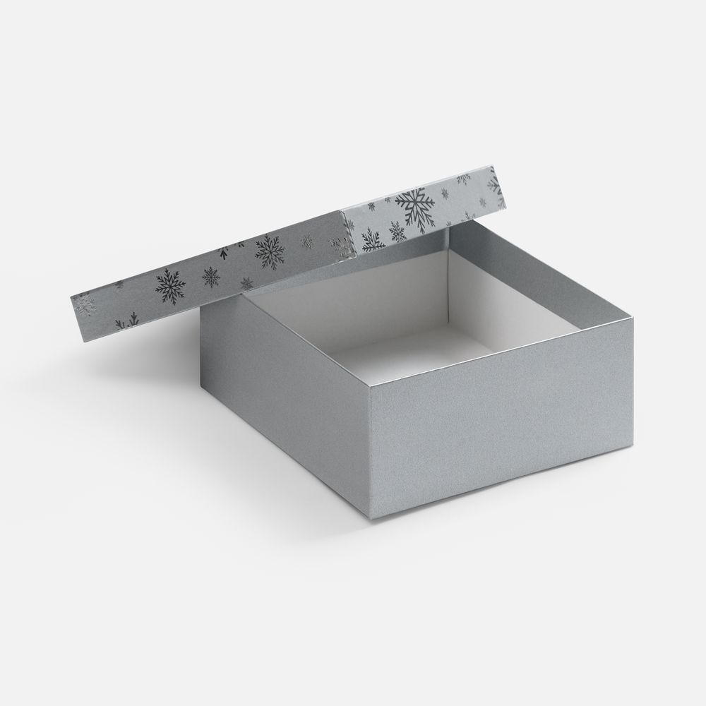 Коробка выполнена из переплетного картона толщиной 1,5 мм, кашированного бумагой TPG с тиснением серебристой фольгой.