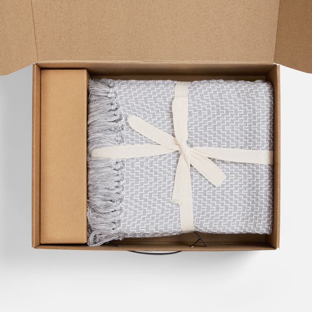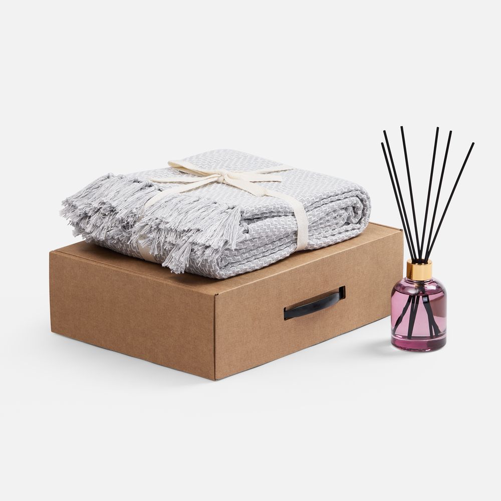 Материал: плед - хлопок 80%, полиэстер 20%, плотность 260 г/м²; флакон - стекло, палочки из файбера; коробка - микрогофрокартон