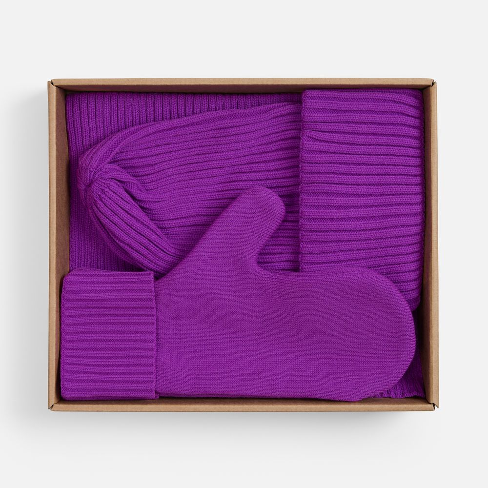 В набор входят удобный шарф с технологичным отверстием для быстрого завязывания, шапка с двойным отворотом и теплые двухслойные варежки с широкой манжетой. Все изделия связаны из акриловой пряжи, отличаются практичностью и элегантной простотой.