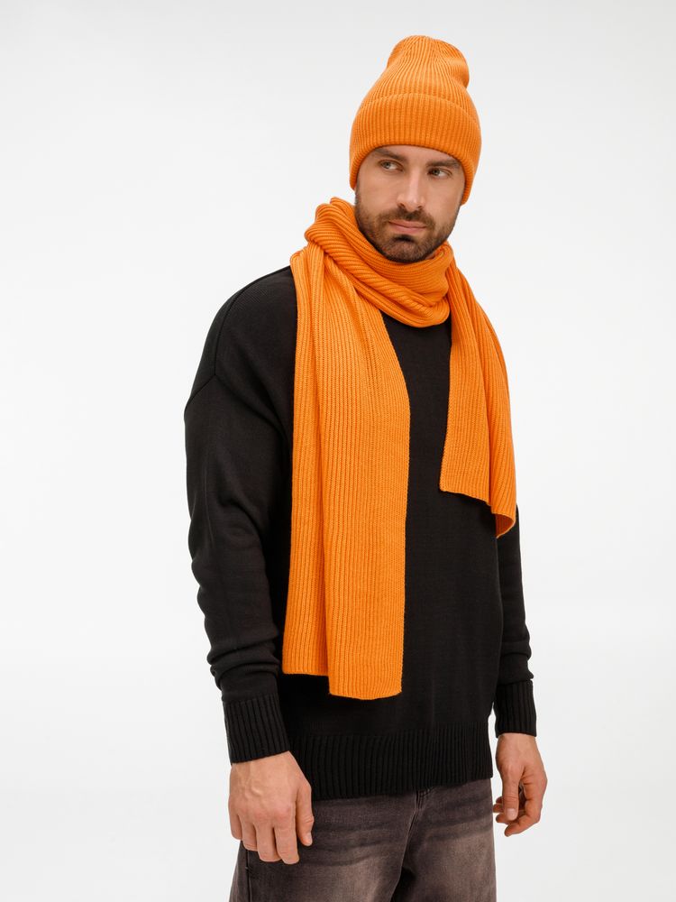Удлиненная шапка с широким отворотом и фактурной вязкой мягко облегает голову, создавая элегантный силуэт. Широкий шарф с выразительным рельефом позволяет экспериментировать с драпировками, добавляя образу объем и динамику. Перчатки с аккуратной резинкой на манжете обеспечивают идеальную посадку и тактильный комфорт. Набор поставляется в брендированной коробке.