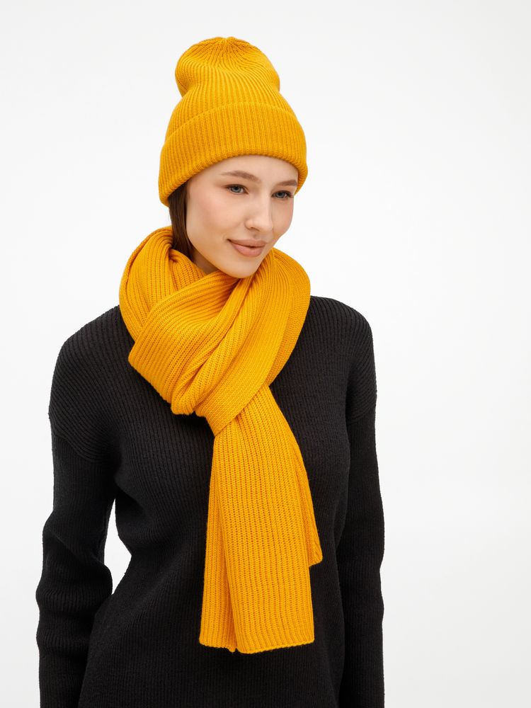 Удлиненная шапка с широким отворотом и фактурной вязкой мягко облегает голову, создавая элегантный силуэт. Широкий шарф с выразительным рельефом позволяет экспериментировать с драпировками, добавляя образу объем и динамику. Перчатки с аккуратной резинкой на манжете обеспечивают идеальную посадку и тактильный комфорт.