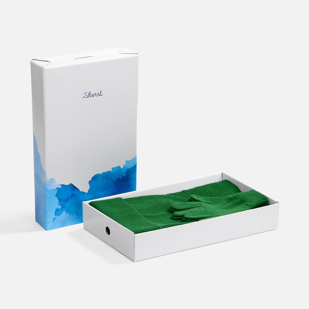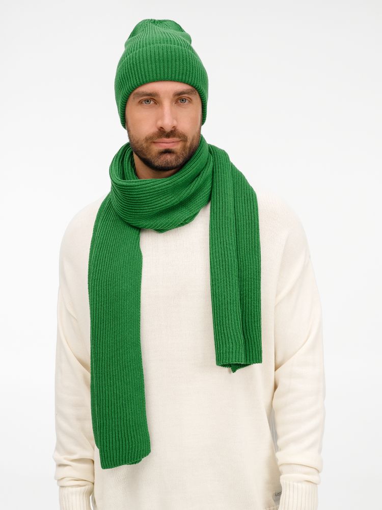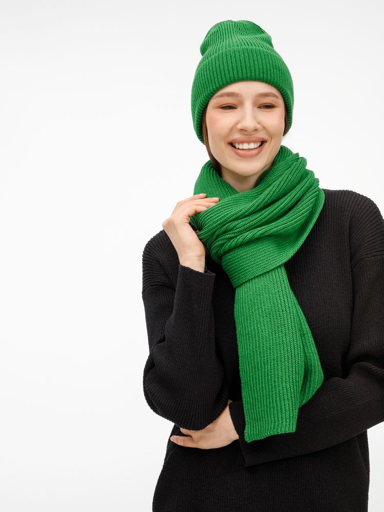 Удлиненная шапка с широким отворотом и фактурной вязкой мягко облегает голову, создавая элегантный силуэт. Широкий шарф с выразительным рельефом позволяет экспериментировать с драпировками, добавляя образу объем и динамику. Перчатки с аккуратной резинкой на манжете обеспечивают идеальную посадку и тактильный комфорт. Набор поставляется в брендированной коробке.