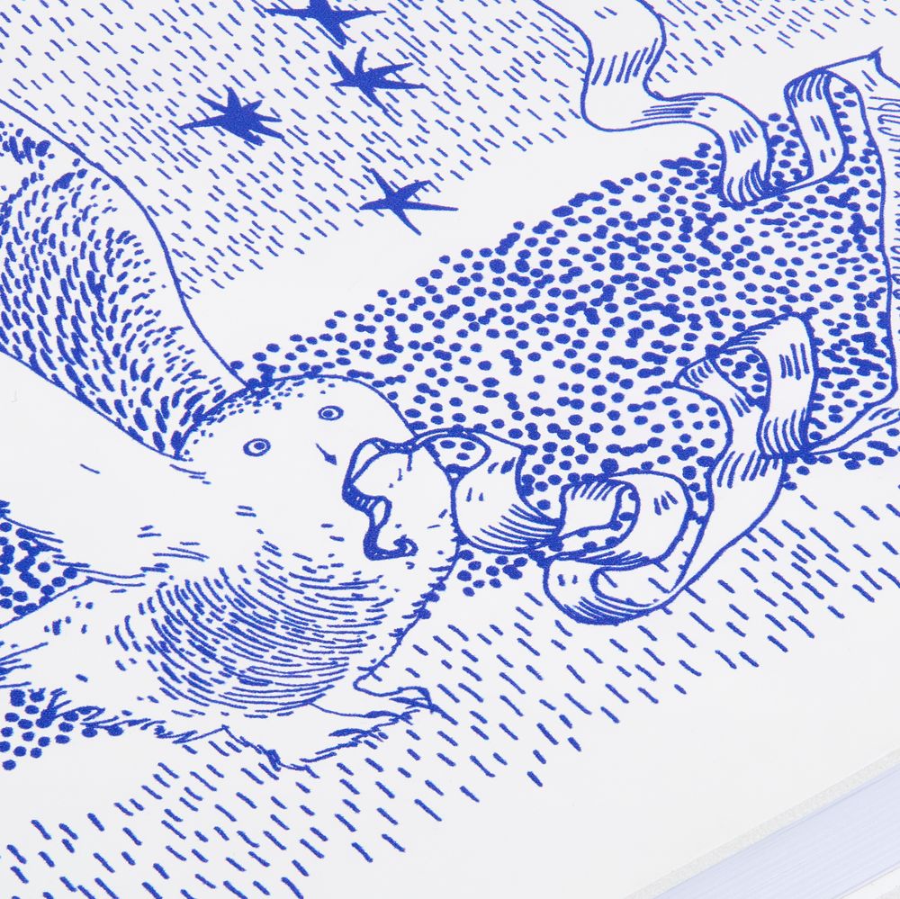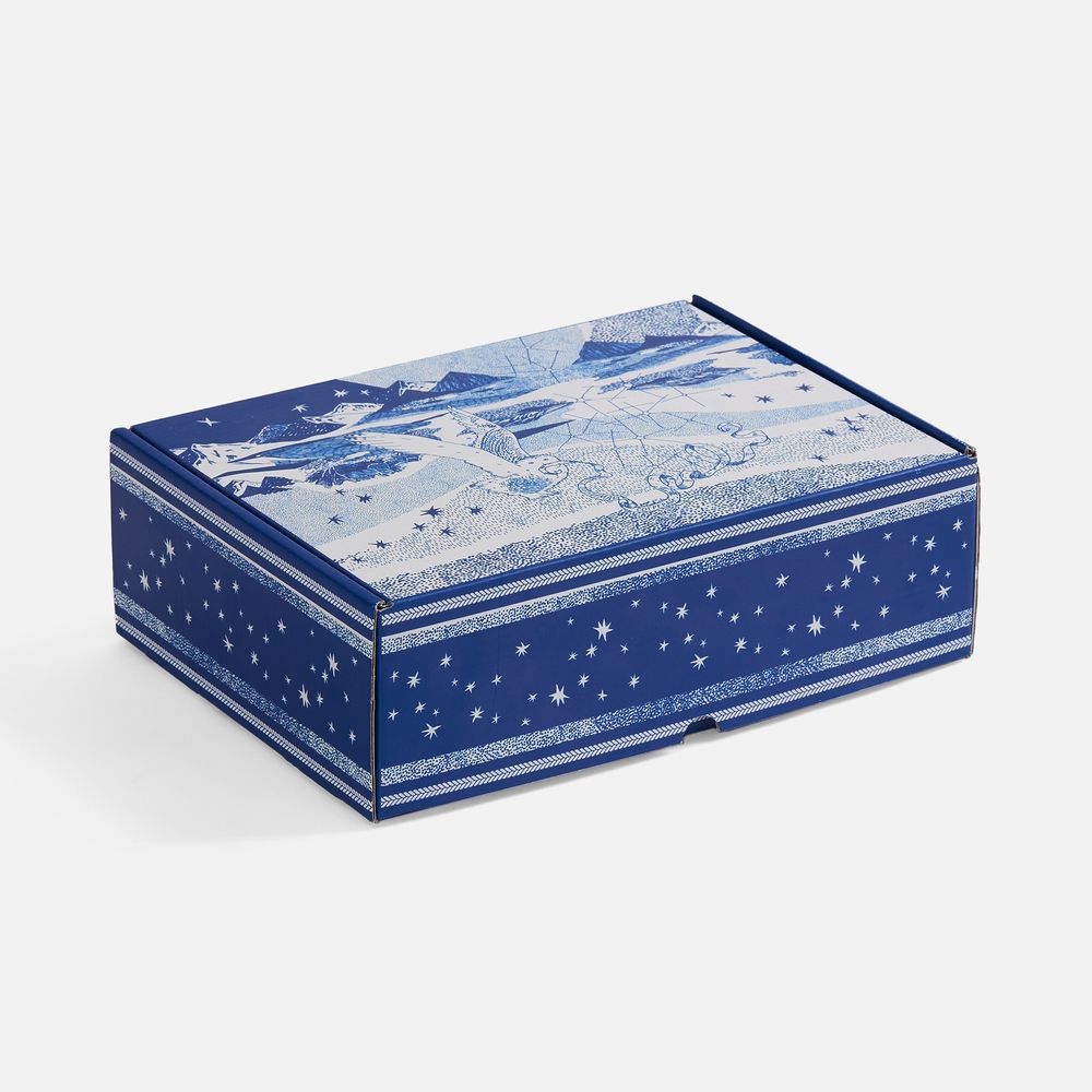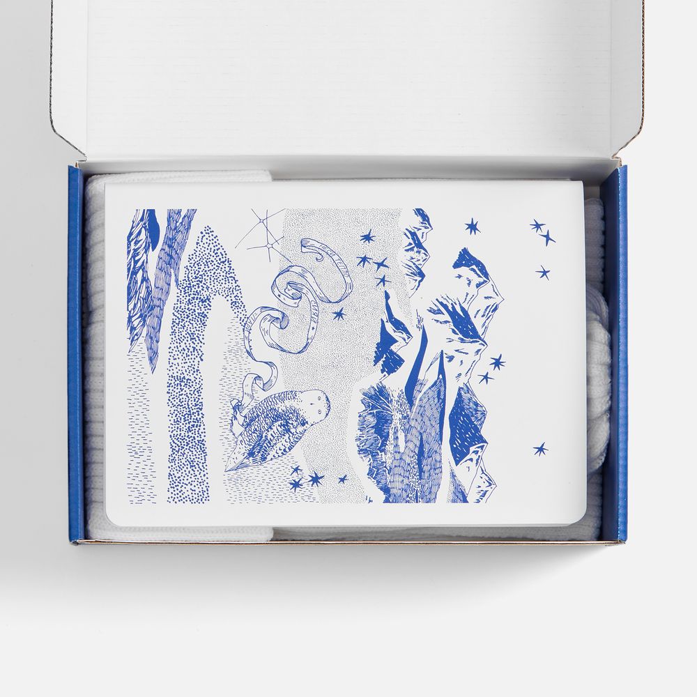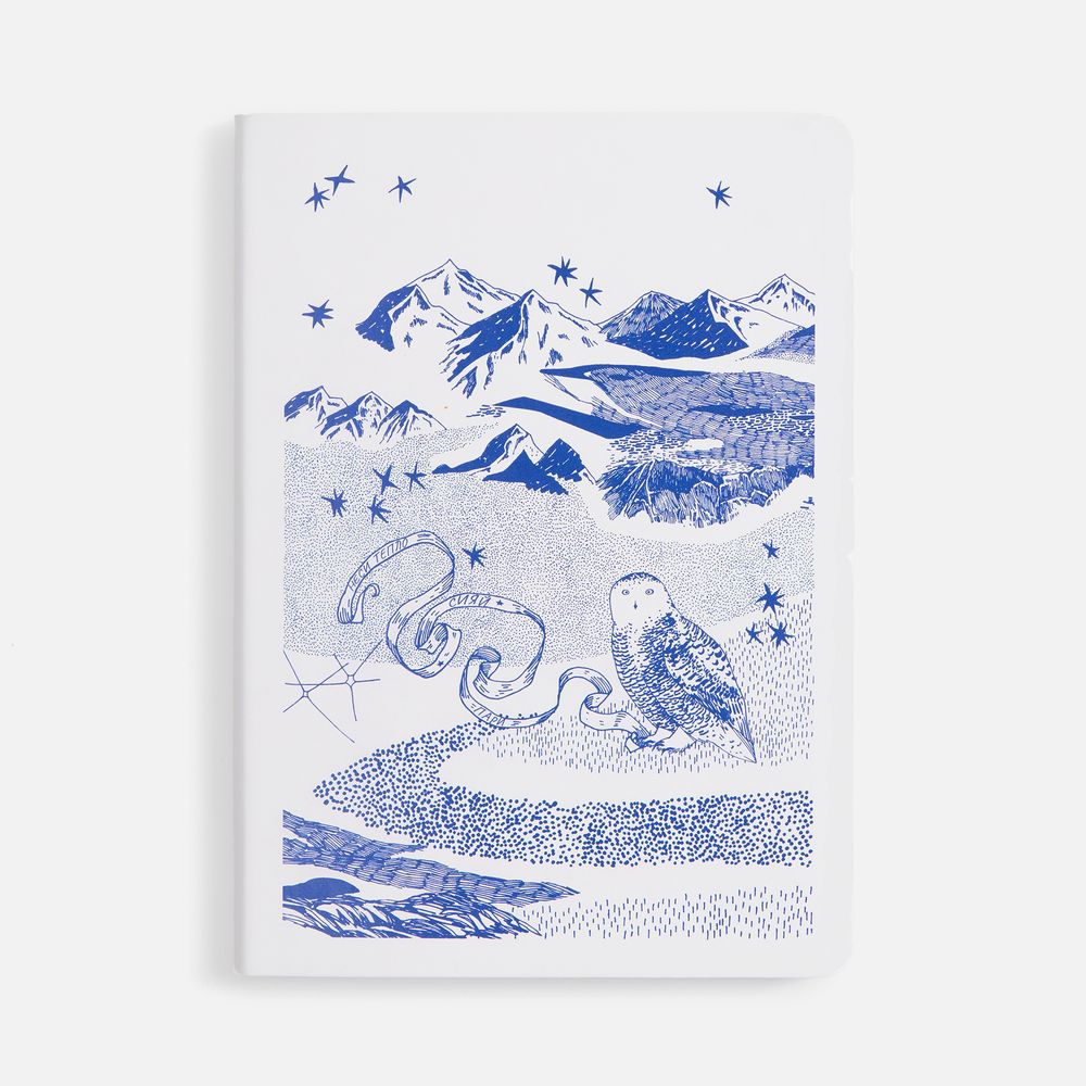 Подарочная упаковка и блокнот украшены чарующим детализированным изображением с совами на фоне бескрайнего горного пейзажа. Мудрые птицы несут на лентах важные послания с заветами на будущий год, а тончайшие линии выверенного рисунка создают неповторимое полотно северной сказки. Оттеняют магию Севера белоснежные шапка и шарф, которые подарят ощущение чистого зимнего утра и непередаваемого комфорта.