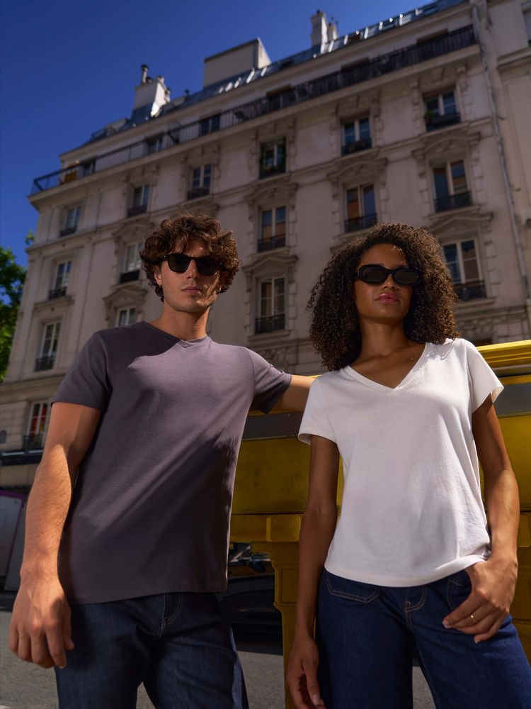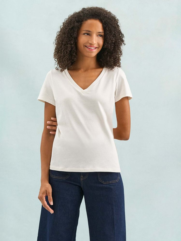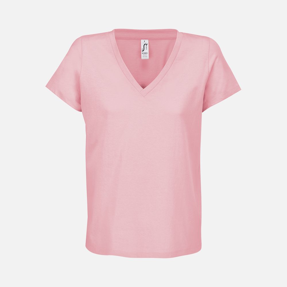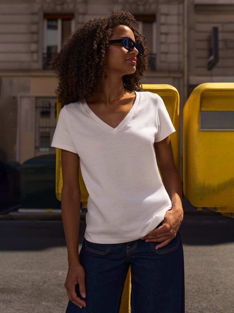 Женская футболка Regent с V-образным вырезом. Такой вырез снова актуален: он визуально удлиняет шею, подчеркивает линию ключиц и добавляет образу легкости.