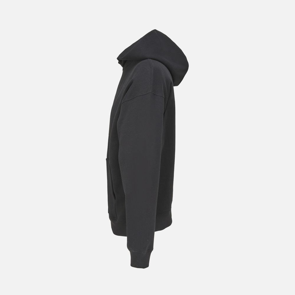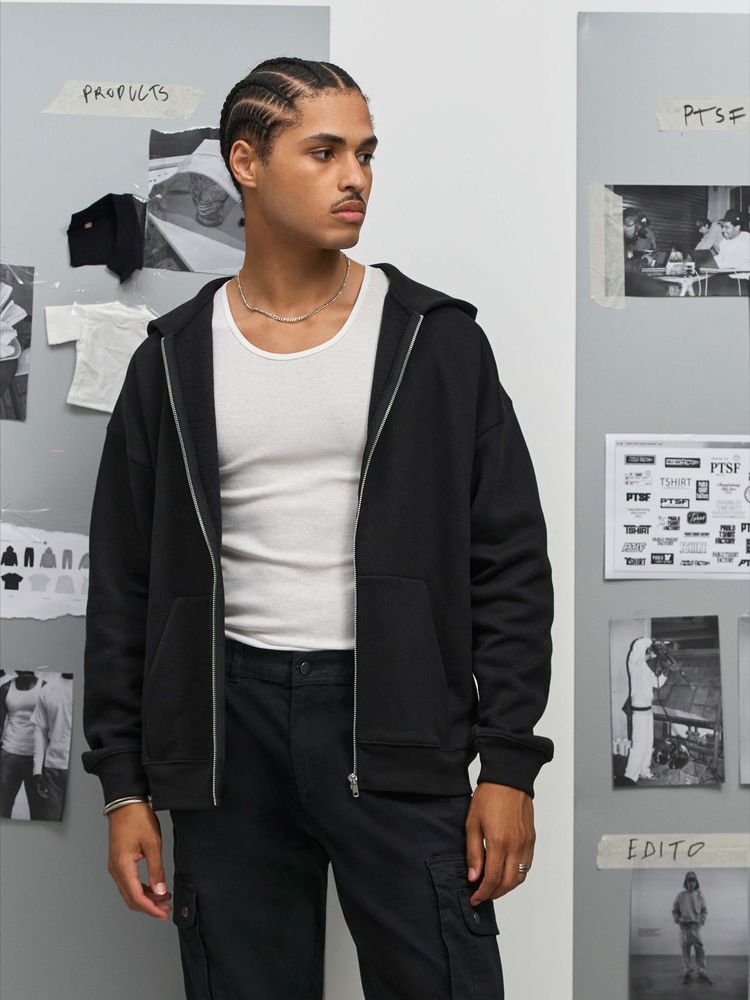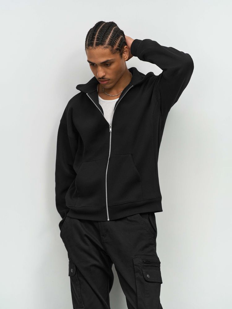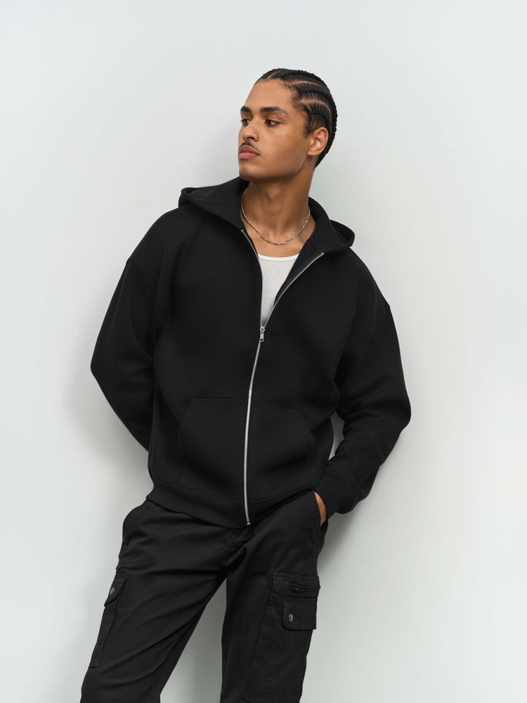 Толстовка на молнии свободной посадки. Благодаря высокой плотности изделие хорошо держит форму, а изнанка с начесом обеспечивает тепло и комфорт.