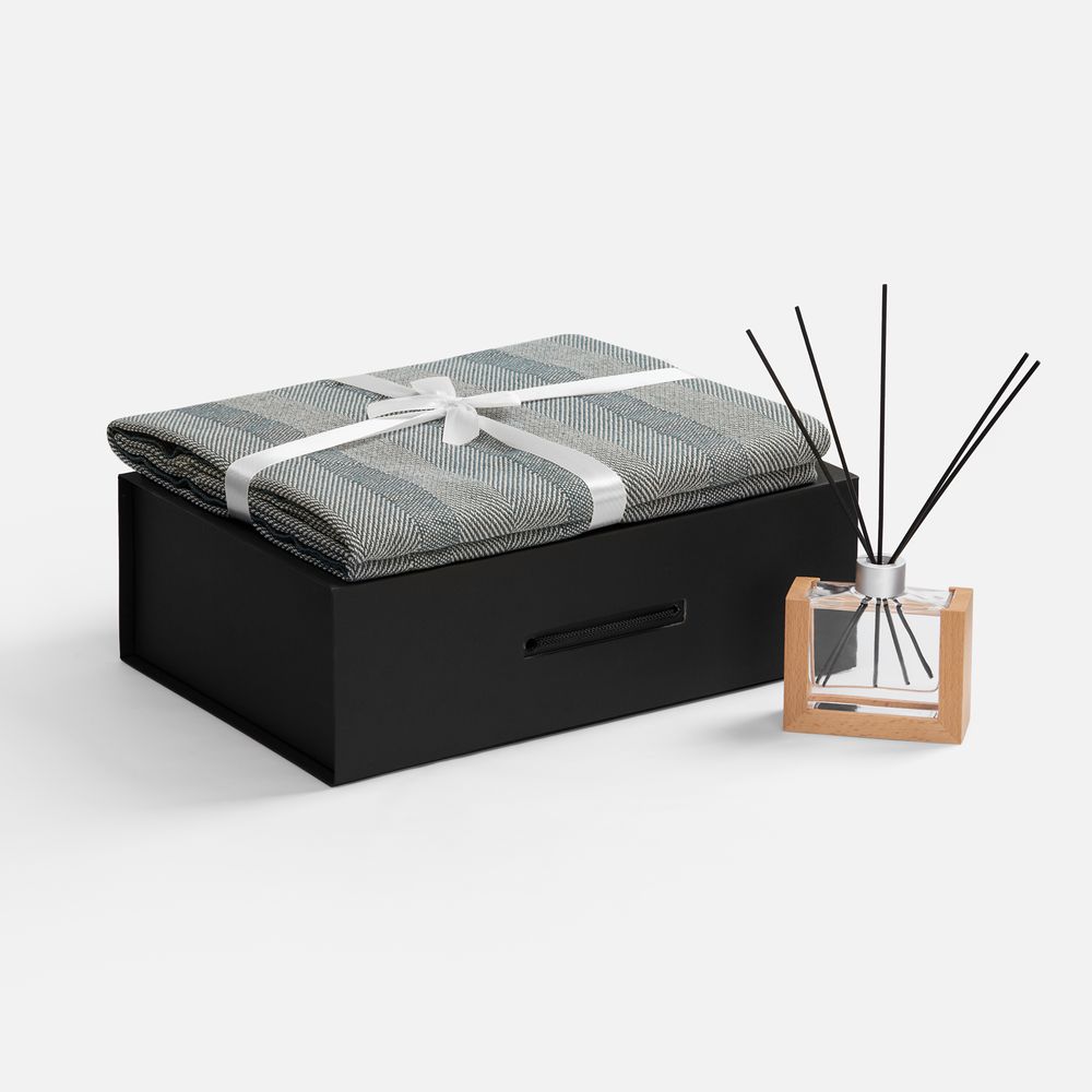 Материал: флакон - стекло, палочки из файбера; подставка для флакона - дерево; плед - хлопок 95%, полиэстер 5%, плотность 300 г/м²; коробка - переплетный картон, бумага Malmero