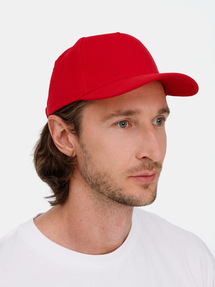 Модель бейсболки с 5-ю клиньями без лобового шва из плотного чесаного хлопка.