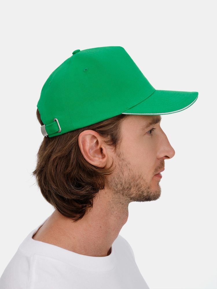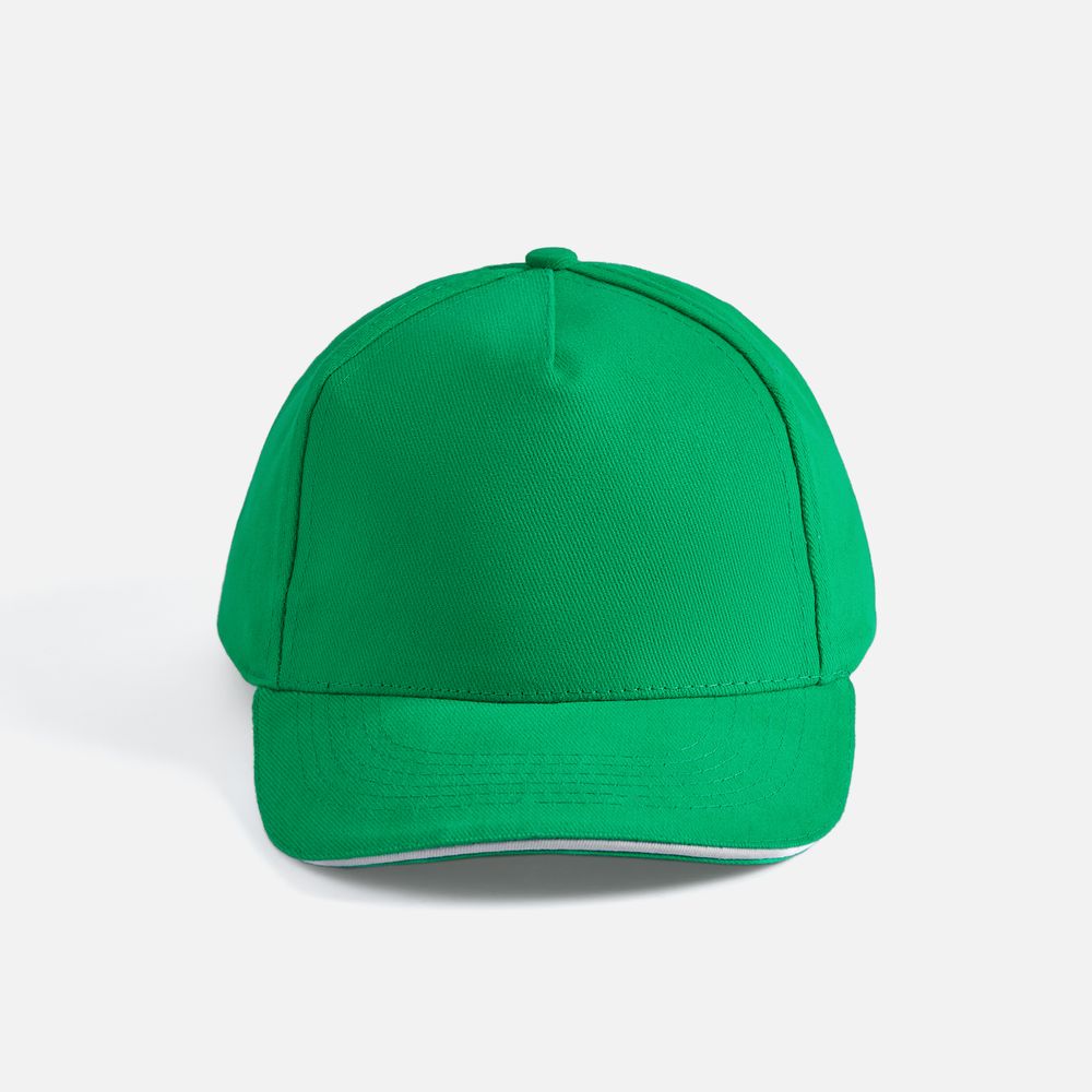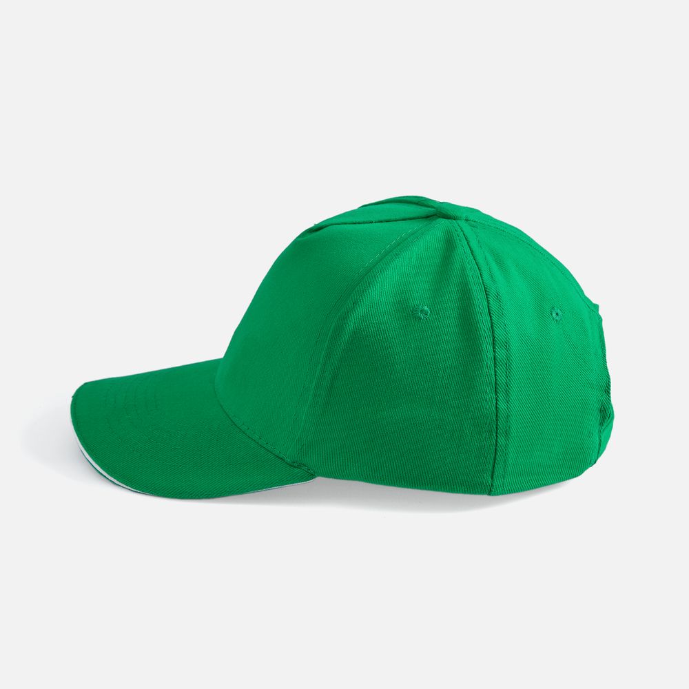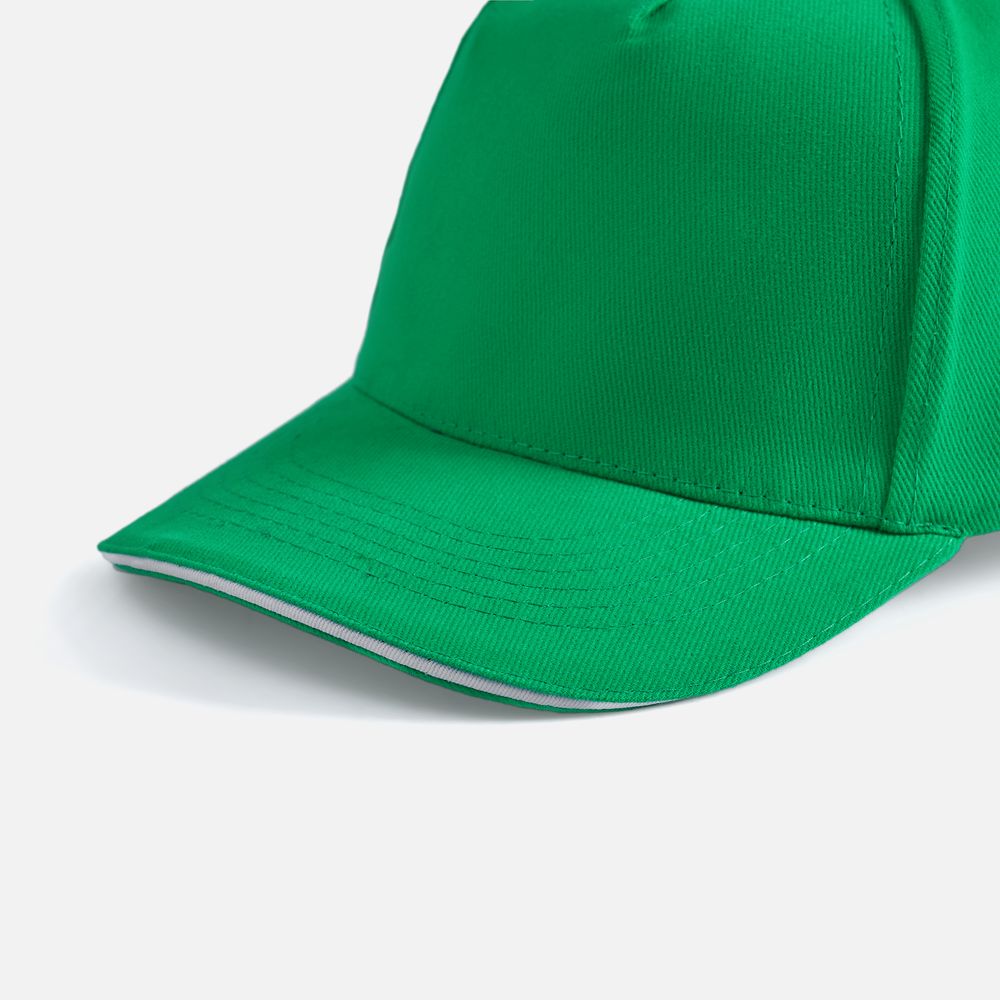 Модель бейсболки с 5-ю клиньями без лобового шва из плотного чесаного хлопка.
